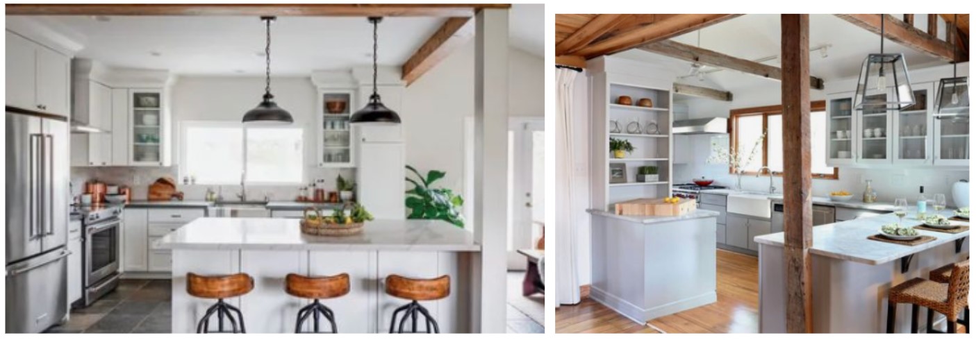By punching a hole in the kitchen wall, we are able to keep the support post hidden, while still opening up the flow between the outdoor area and the kitchen. My client was concerned that pass-through islands are outdated. They’re not! Check out these modern, welcome, and charming pass-through island designs.