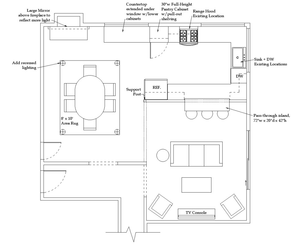 It feels so boxy, doesn’t it? One of my client’s complaints was that there wasn’t easy flow from the kitchen to the outdoor space. When enjoying her backyard, she (and her guests) would have to walk through the living room, into the entryway, through the dining space and around the sharp corner just to retrieve a beverage from the fridge. There must be a better layout, right?